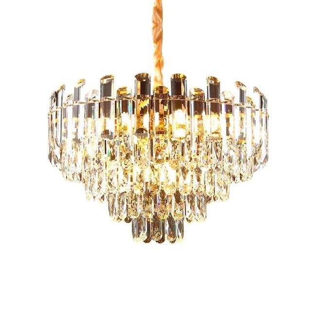Com estrutura em metal dourado e detalhes em cristal transparente, sua composição reflete a luz de forma única, criando um ambiente elegante e imponente.