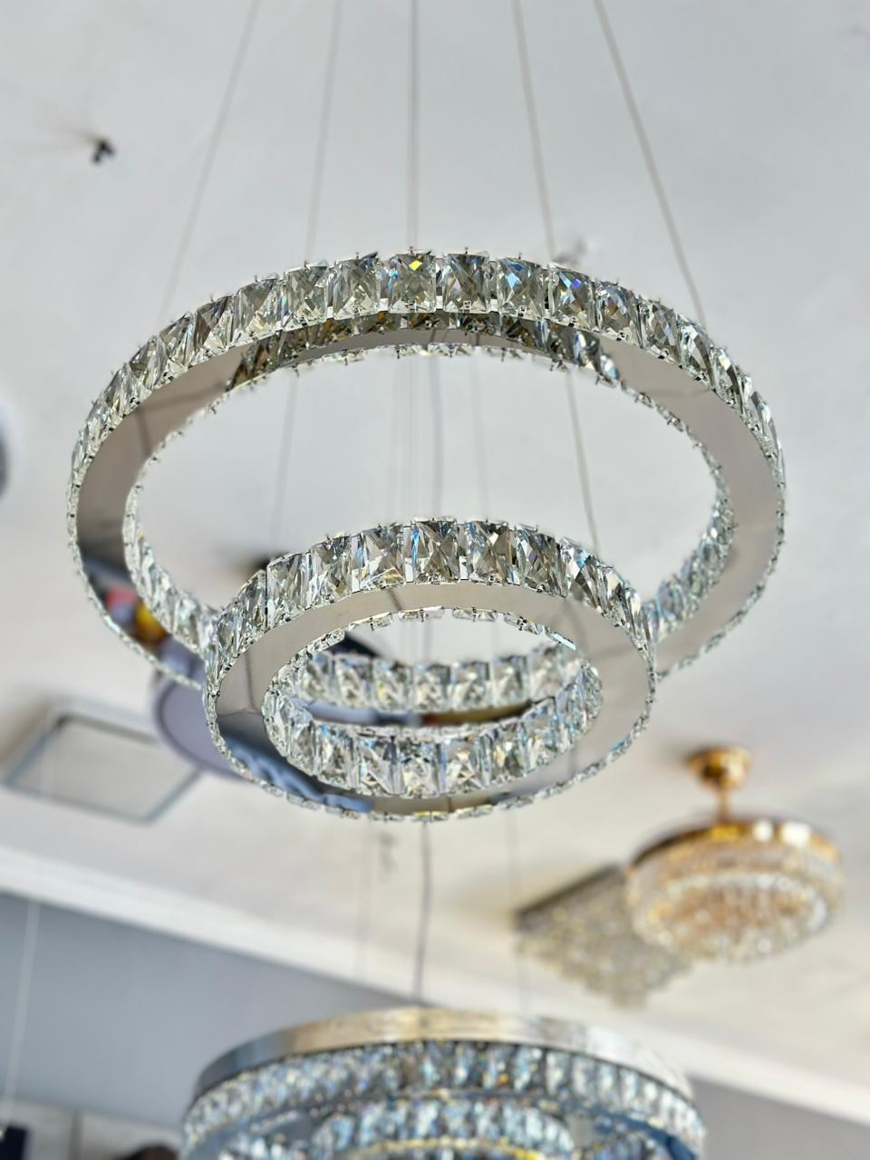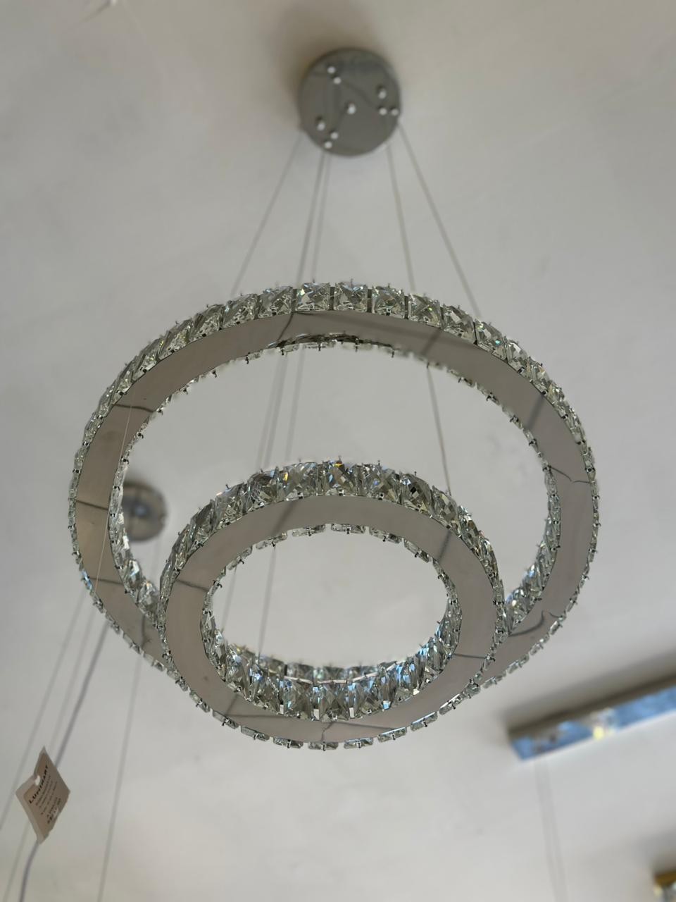 O Pendente Sindora Ø30×50cm é uma peça sofisticada que combina o brilho do metal cromado com a delicadeza dos cristais transparentes, proporcionando um visual moderno e luxuoso.