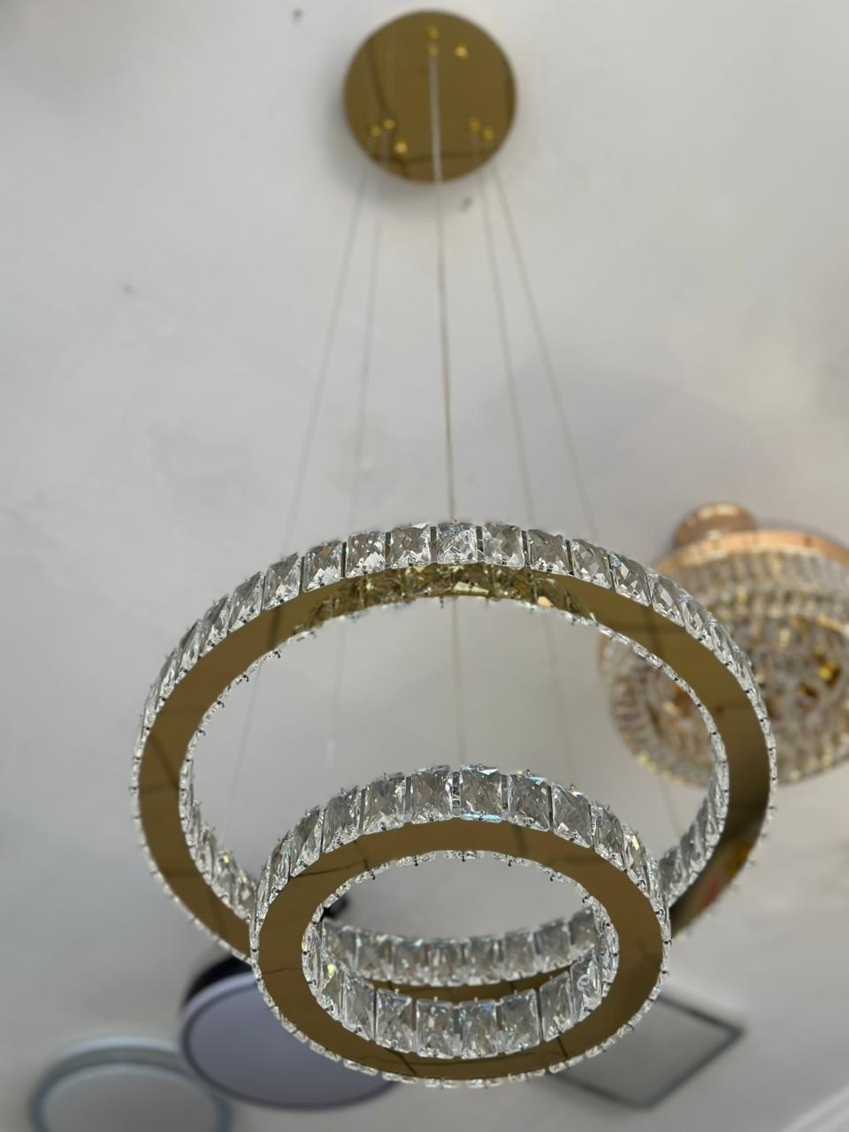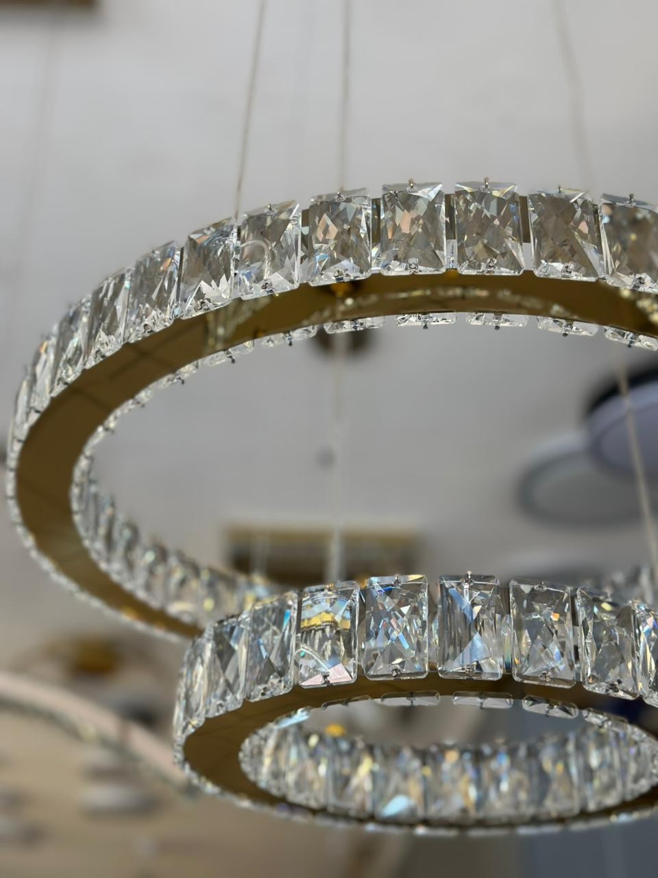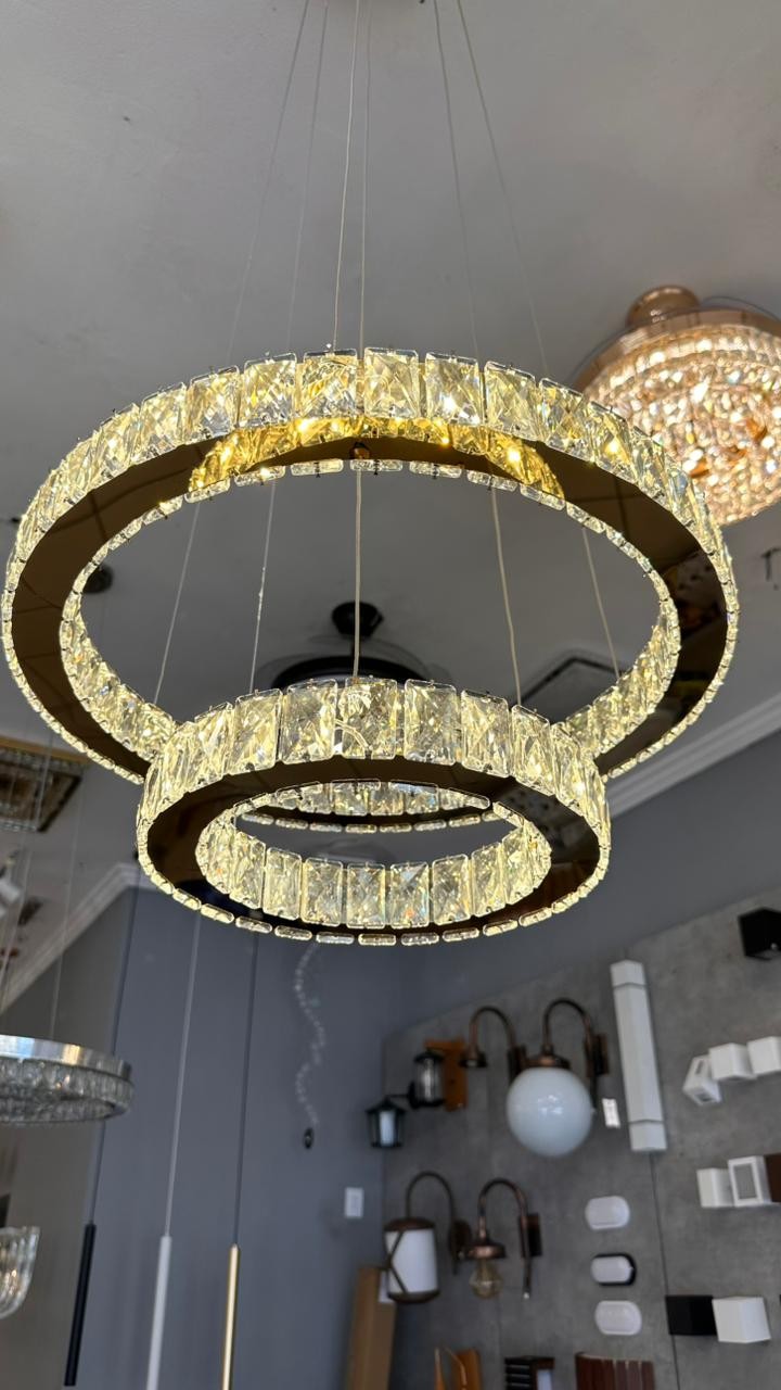Com estrutura em metal dourado e detalhes em cristal transparente, esta peça cria um visual luxuoso e contemporâneo, ideal para composições sofisticadas em salas de jantar, estar, halls e ambientes comerciais de alto padrão.