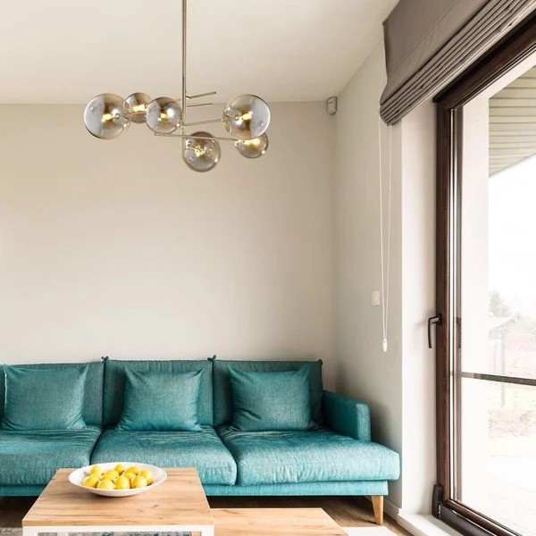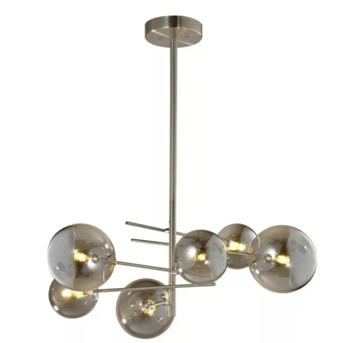 Com estrutura em acabamento nickel e cúpulas em vidro fumê, o modelo apresenta design moderno que valoriza salas de estar, jantar, halls de entrada e até mesmo ambientes comerciais que exigem estilo refinado.